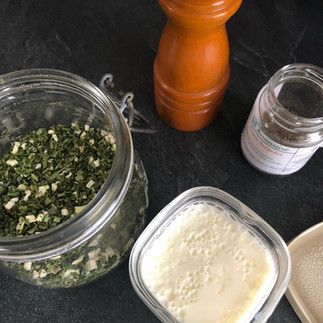 - j’ai préparé une sauce au yaourt maison avec du sel au thym, des herbes et de l’ail séché et du poivre du moulin